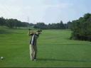 | 最終18番のティーショット この球の打ち出した角度を見てください。 打ったとたんに球を見失いましたがガサッと言う音のおかげで球が見つかりました。 ドてんぷらで左の林の中へ。100ヤードも飛んでない感じです。 cyu−ちゃんに右肩が落ち込んでるからレベルスイングにしたほうがいいよとアドバイスを受け♂ |